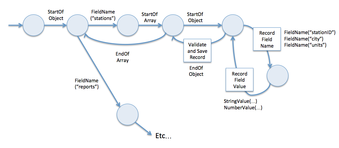 The purpose of a state machine is to remember which part of the JSON object we’re currently processing. In our weather station example, we start by scanning through the "stations" section while collecting meta-data about the location and measurement units of each station. Once we reach the end of the array, we then switch to a different state for processing the content of the reports array.