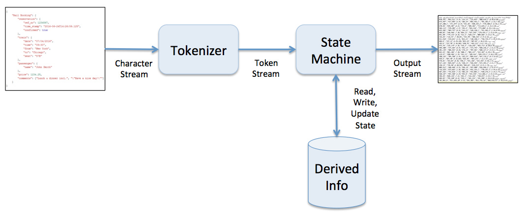 The following diagram illustrates our overall solution for reading a stream of JSON, while maintaining derived information as we progress through the input. The two main components we should focus on are the Tokenizer and the State Machine.